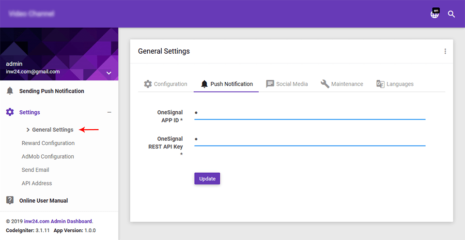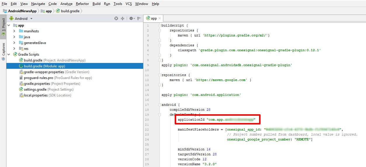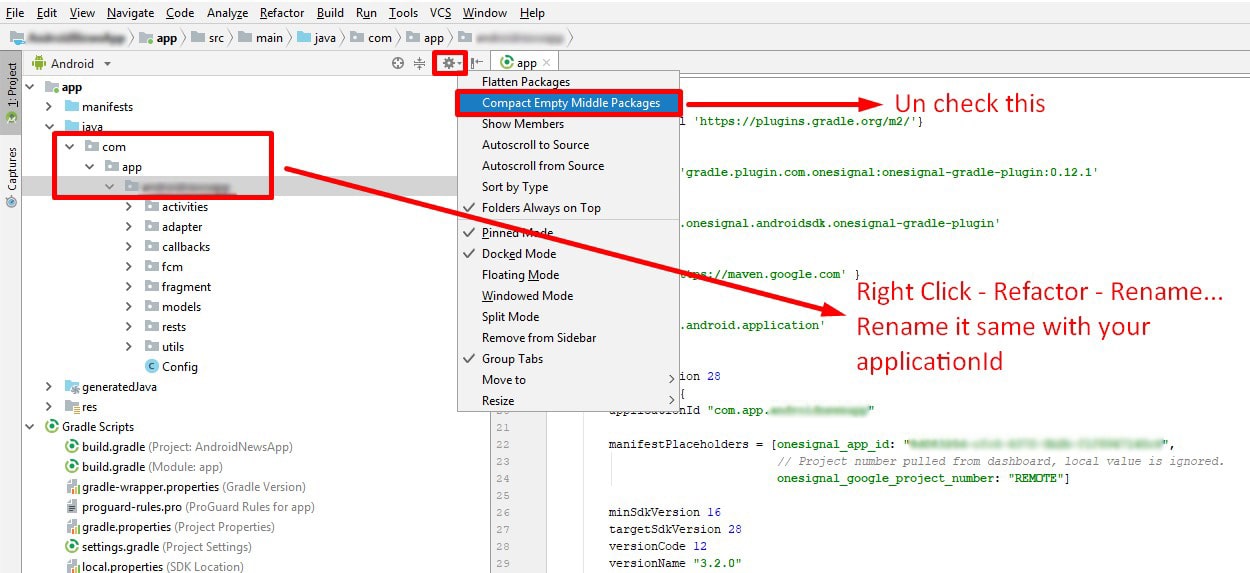 Update ONESIGNAL_APP_ID value from app > java > PackageName > Config.java with your OneSignal app id.